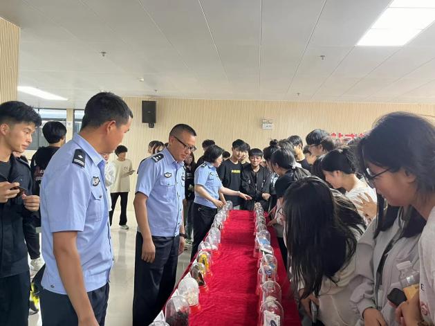 活动二:禁毒知识咨询和毒品模型展示。讲座结束后后,移步至大学生活动中心,进行禁毒知识现场咨询,同时现场展示毒品模型,云南省第五强制隔离戒毒所专业警察现场讲解,加强师生对识毒、防毒、拒毒等禁毒知识的认知。期间戒毒所为同学们提供了禁毒知识法律咨询的服务,同学们积极咨询和了解,强化安全管理意识。活动结束后,双方现场合影留念。
