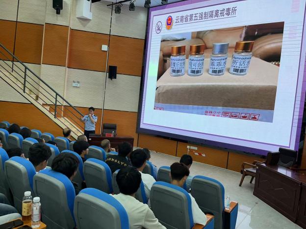活动一:校园禁毒知识宣传专题讲座。云南省第五强制隔离戒毒所教育矫正中心潘紫东警官以“珍爱生命,远离毒品”为题,采取线上线下相结合的方式,为全校师生从戒毒所里干什么、认识新型毒品、毒品带来的危害、如何预防吸毒等方面带来精彩授课。出席本次讲座的领导有云南省第五强制隔离戒毒所教育矫治科副科长甘榜峨警官、云南省第五强制隔离戒毒所一大队副大队长李卫明警官、嵩明职教新城管理委员会办公室主任陈富义主任,学校党委书记张向英同志、副校长武绍宏同志,各职能部门、教学单位负责人以及师生代表共同参与。讲座以“禁毒宣誓”收尾,全员起立,共同宣誓,入脑入心,引导师生真正做到远离毒品,共同维护社会和谐稳定。