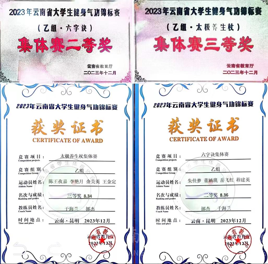 12月23日,2023年云南省大学生健身气功锦标赛在昆明文理学院(杨林校区)开赛,有29所高校85支代表队340名在校大学生参加,比赛项目有大舞、马王堆导引术、导引养生功等9种普及功法和易筋经、五禽戏、六字诀、八段锦等4种竞赛功法,分集体赛和个人赛形式进行。