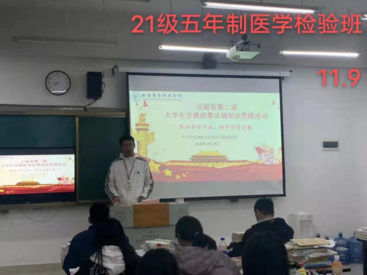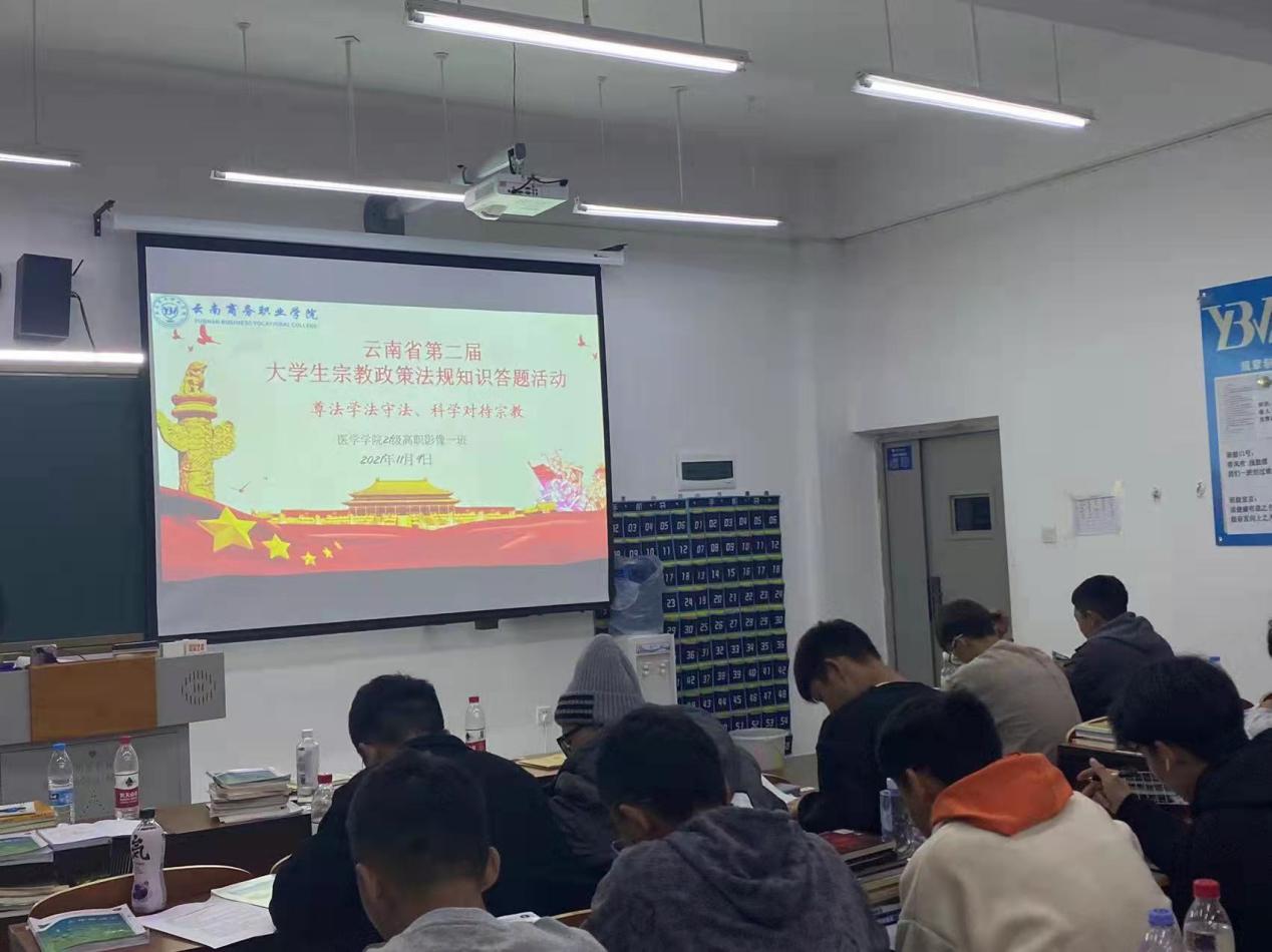 为贯彻落实中央和省委、省委教育工委关于加强宗教政策法规知识教宣传工作的有关要求,普及宗教知识,宣传国家有关法律法规,加强马克思主义宗教观教育,2021年11月9日晚,中共金年金字招牌诚信至上委员会医学学院党支部组织医学学院各个班级在各班教室,开展了以“尊法学法守法,科学对待宗教”为主题的宗教政策法规答题活动。
