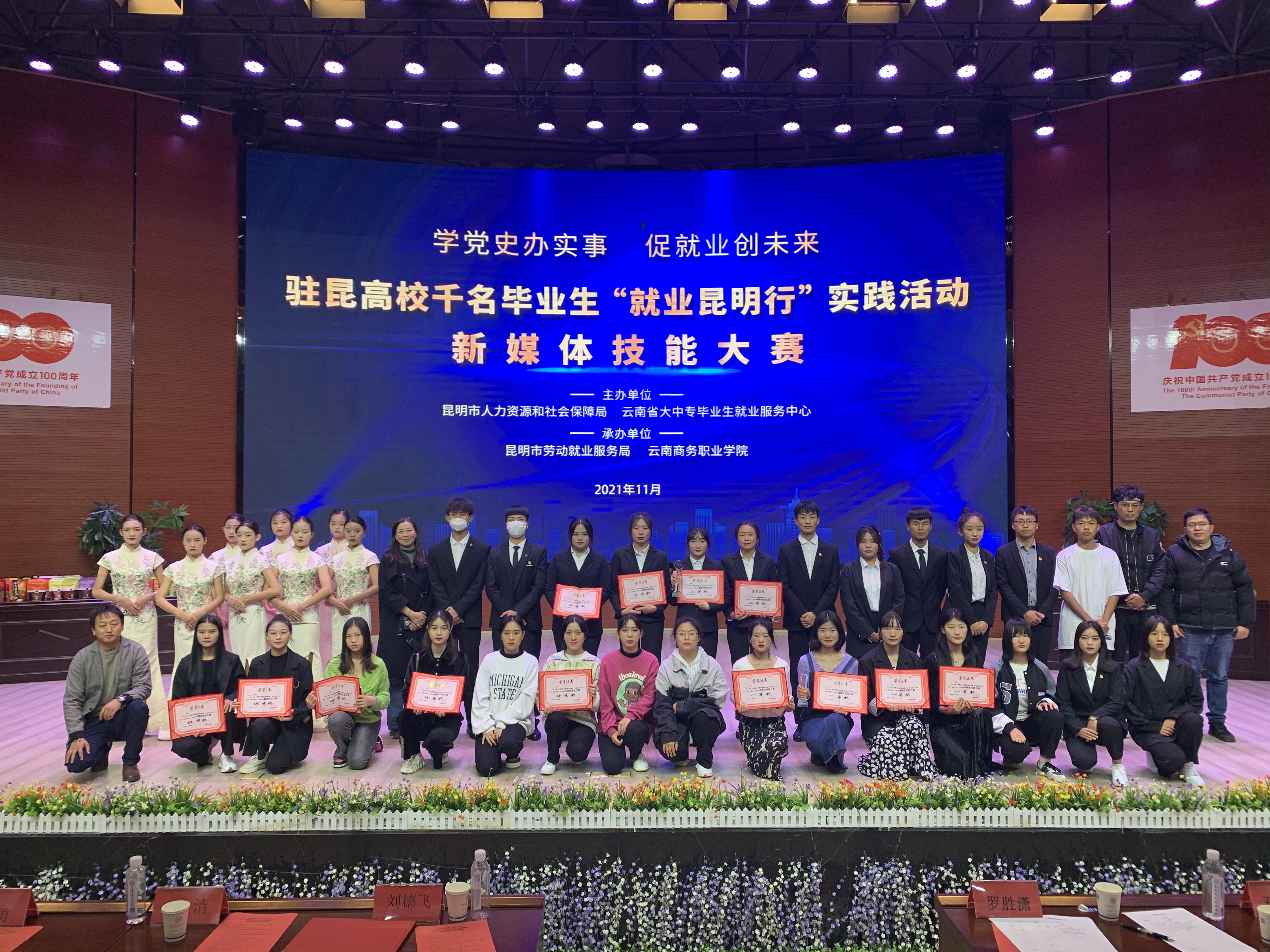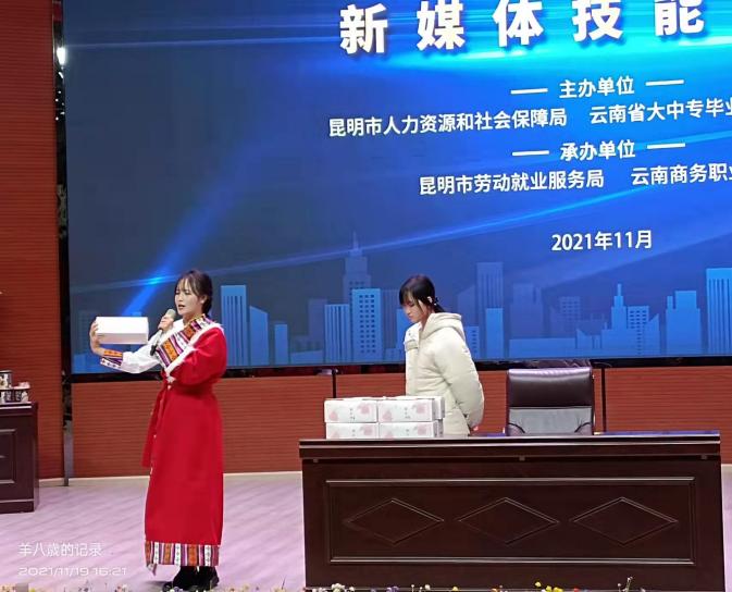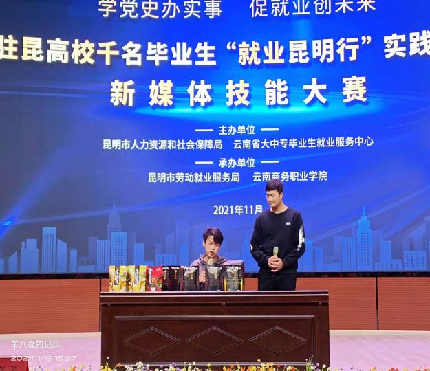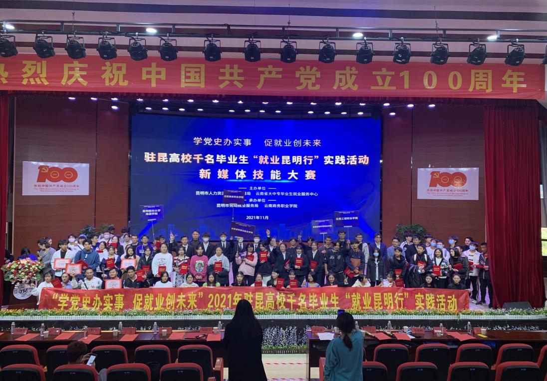 为深入实施昆明市高校毕业生就业计划,全面宣传促进高校毕业生就业各项政策,推动高校毕业生实现更高质量就业,由昆明市人力资源和社会保障局、云南省大中专毕业生就业服务中心主办,昆明市劳动就业服务局、云南商务职业学院承办,昆明市就业促进会协办的以“学党史办实事,促就业创未来”为主题的2021年驻昆高校千名毕业生“就业昆明行”新媒体技能大赛于11月19日在我校顺利举办。