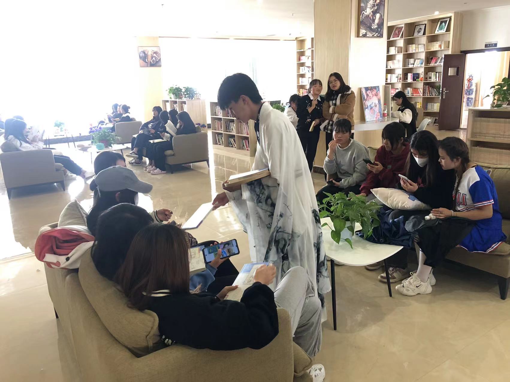 11月11日下午,由图书馆主办,文学社承办,茶艺社、读者协会、国风社协办的宋词推荐会在图书馆举行,有上百名师生参加了此次活动。此次活动分为茶艺展示、宋词推荐、品茶诵读三个部分。