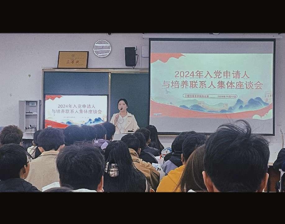 在秋高气爽的季节里,工程与信息学院党支部迎来了一场特别的见面会。2024年10月22日,工程与信息学院党支部组织了一次入党申请人与培养联系人的见面活动,地点设在学院7栋106。此次活动旨在加强党的基层组织建设,促进党员队伍的发展壮大,同时也为有志于加入中国共产党的优秀同志提供了一个展示自我、交流思想的平台。
