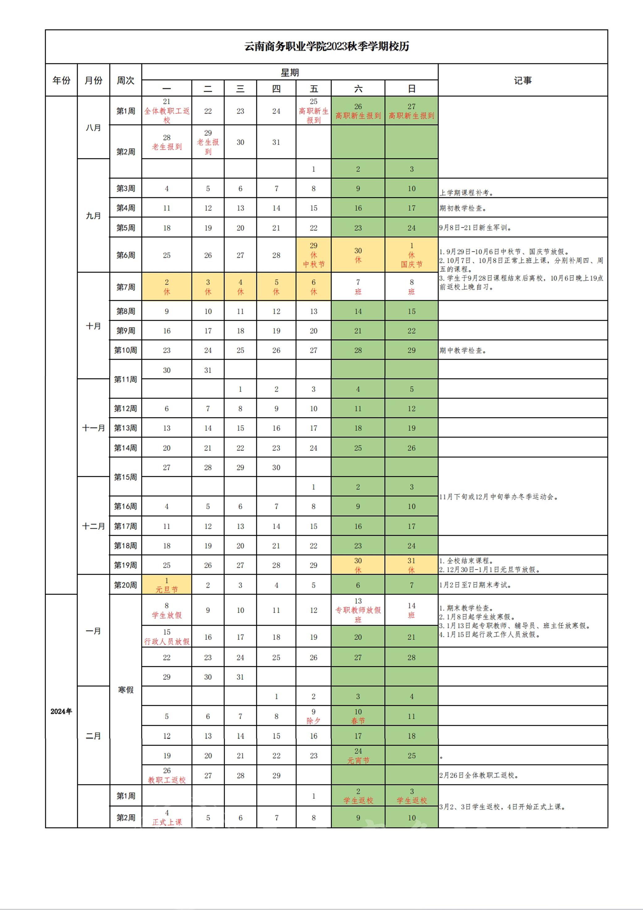 2023年秋季学期校历