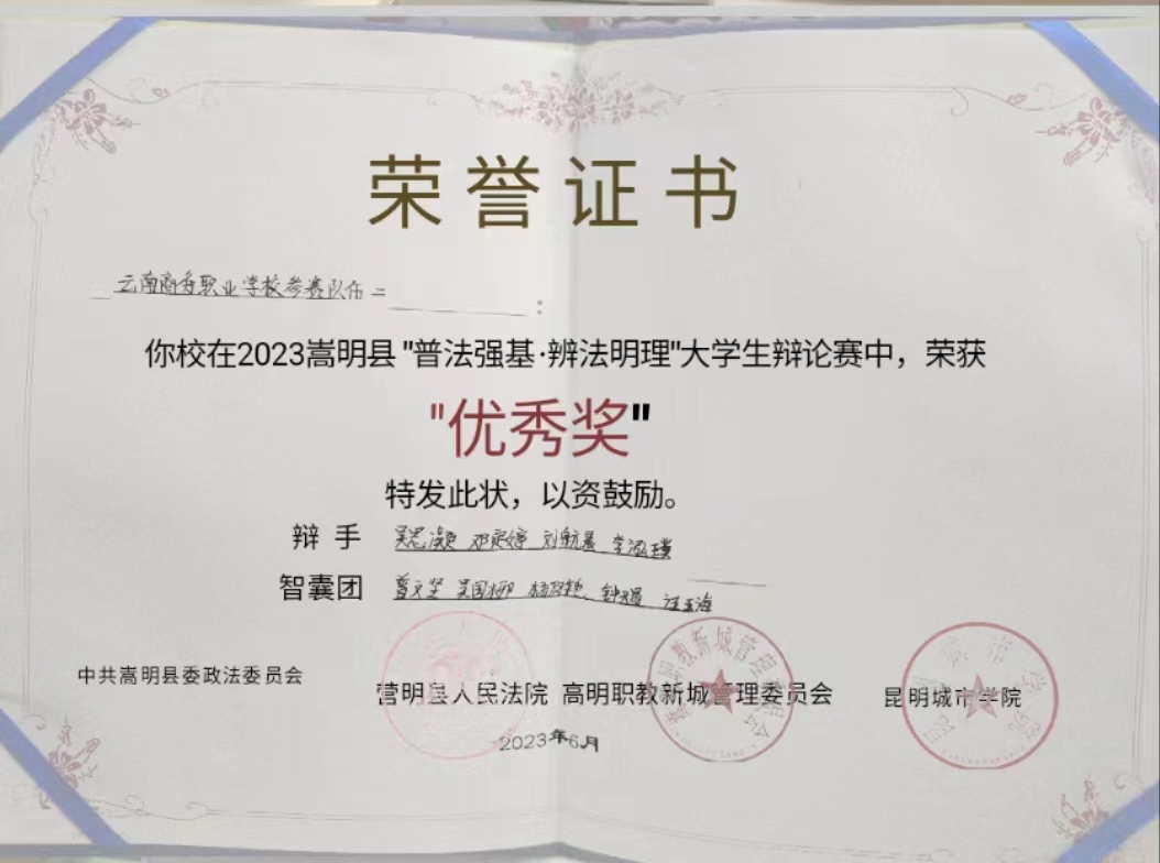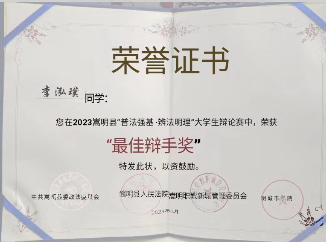 4.2023嵩明县“普法强基·辨法明理”大学生辩论赛中,荣获“最佳辩手奖”4项;